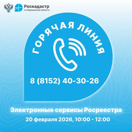 20 февраля 2026 года с 10:00 до 12:00 в филиале ППК «Роскадастр» по Мурманской области пройдет горячая линия, посвященная вопросам использования электронных сервисов Росреестра: справочная информация по объектам недвижимости, жизненные ситуации, федеральная государственная географическая информационная система «Единая цифровая платформа «Национальная система пространственных данных», проверка электронного документа, проверка исполнения запроса (заявления), техническая поддержка и т.д.